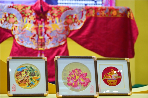 艺术工艺品外,云锦研究所更带来具有“中华皇室工艺,世界潮流时尚”表现力的云锦妆花吉服。是南京云锦研究所以云锦博物馆馆藏明代皇后吉服为原型,进行创新织造的服饰代表作。经典红地丝线为底,织入超过目前丝织技术壁垒的13色的绚烂表现,配以大量用金的织金马面裙,一经展示就引起围观、拍照合影。