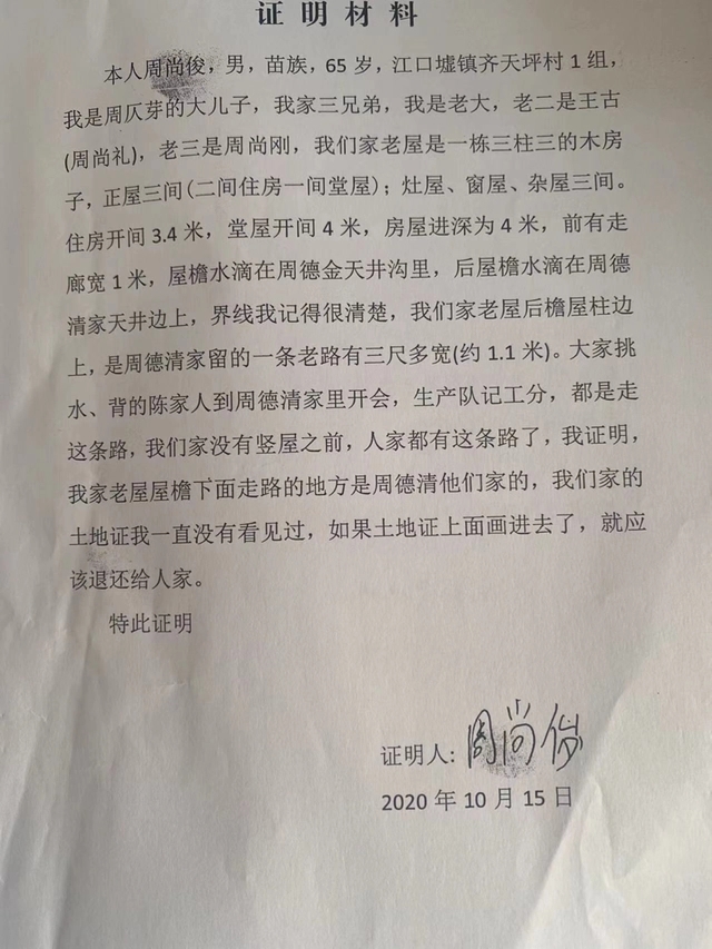 据了解,周尚礼约占有了周尚龙家21个平方。据周尚礼的大哥周尚俊出具的证言显示:“本人周尚俊,男,苗族,现年65岁,家住江口墟镇齐天坪村1组。父亲周仄牙,病故多年,遗留下的宅基地属于我们三兄弟共同财产(大弟周尚礼、小弟周尚刚)。本人结婚后,与家里分家,仅分的一间住房,没有地方打灶煮饭,四口之家陷于困境。邻居堂婶(周尚军母亲)看到我们一家实在可怜,将大门口一块空地借给我建厨房,当时我答应人家,今后如果不使用,就退还人家。”