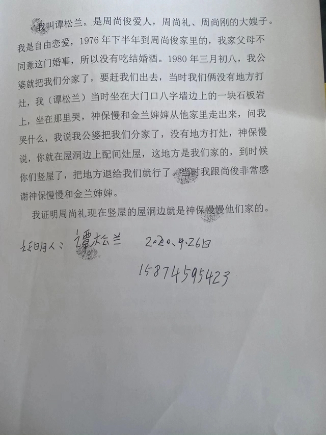 另外,周尚礼大嫂出具的证言显示:“我叫谭松兰,是周尚俊爱人,周尚礼、周尚刚的大嫂子。我是自由恋爱,1976年下半年到周尚俊家里的,我家父母不同意这门婚事,所以没有吃结婚酒。1980年三月初八,我公婆就把我们分家了,要赶我们出去,当时我们俩没有地方打灶,我(谭松兰)当时坐在大门口八字墙边上的一块石板岩上,坐在那里哭,神保慢(慢:叔叔的意思)和金兰婶婶从他家里走出来,问我哭什么,我说我公婆把我们分家了,没有地方打灶,神保慢说,你就在屋洞边上配间灶屋,这地方是我们家的,到时候你们竖屋了,把地方退给我们就行了。当时我跟尚俊非常感谢神保慢慢和金兰婶婶。我证明周尚礼现在竖屋的屋洞边就是神保慢慢他们家的。”周尚礼除占有这间灶房的地方外,另约占了1.5米,共计约21个平方。