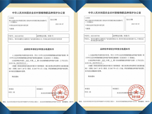 在贺州市委市政府和有关部门的关心与支持下,经过多年的努力和不懈的追求,终于在2023年9月1日,公司选育的茶树品种“桂紫1号”“桂紫2号”成功通过中国农业农村部的茶树新品种权申请公示。