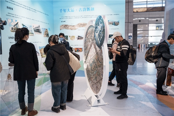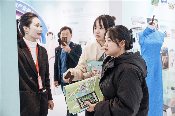 展厅内浓郁的人文气息和蓬勃的城市风貌,吸引了众多旅客前来欣赏、咨询。“千年大运·古韵新颜”展板上面一幅“康熙南巡图”描绘的运河协奏仿佛看到了浒墅关昔日的繁华盛景。非遗技艺展品匠心独韵,蒲扇微摇、草席微凉、微型二胡、红木微雕、篆刻之美、手工工艺旗袍等非遗展品以及蚕里文创产品,这些浒墅关独特的文化符号一起构成一幅文化为魂的和美画卷,与展板上面的“康熙南巡图”彼此呼应。