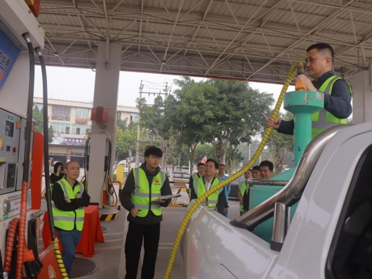 在确保加油机显示屏“回零”的情况下,计量所专家拿起其中一台加油机的加油枪,将加油量设置为100升的成品油注入加油机强检专用的标准金属计量桶内,通过测量油温修正后,在现场嘉宾的见证下,宣布检测符合国家相应标准。
