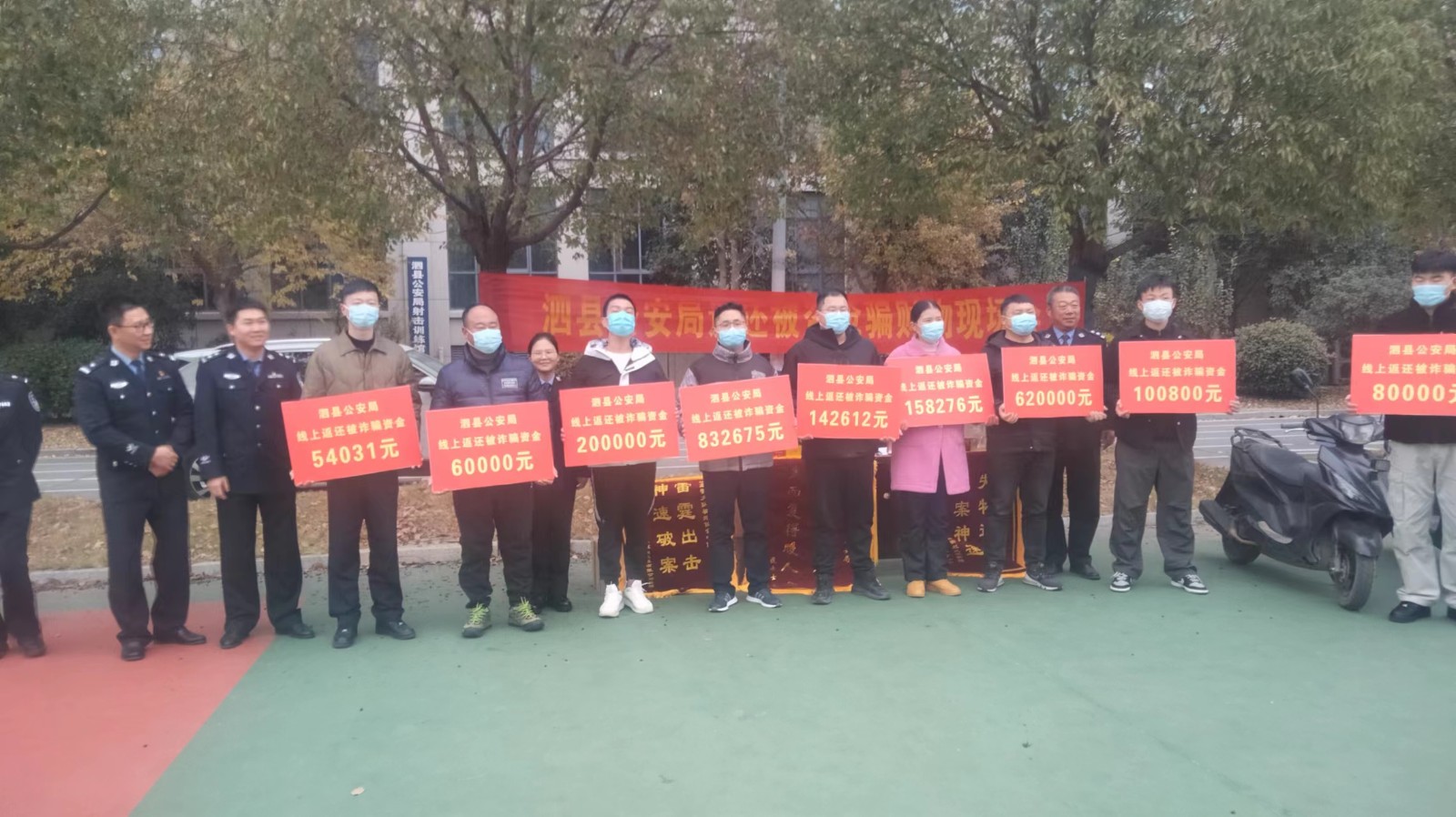 2023年12月13日,安徽省泗县公安局刑警大队在本局院内召开集中退还被盗抢骗财物现场大会,现场返还群众被盗、抢、骗涉案资金500余万元及部分实物,其中利用互联网线上返还355万元,线下返还123万元,还有部分被盗车辆及香烟、名酒、金银首饰、工地电缆等实物价值39万余元,该局用实际行动切实提高了群众对泗县治安环境的安全感、满意度,全力提升人民群众获得感、幸福感。为泗县的经济社会发展创造了良好的社会环境。