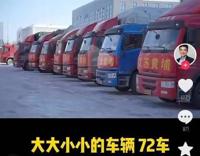 这次也是这个玩法,在陈光标发布的视频中,他为灾区准备的价值1300万元的物资,分别装了72辆卡车。这些卡车停放在南京街头和停车场里,车队一眼望不到头。
