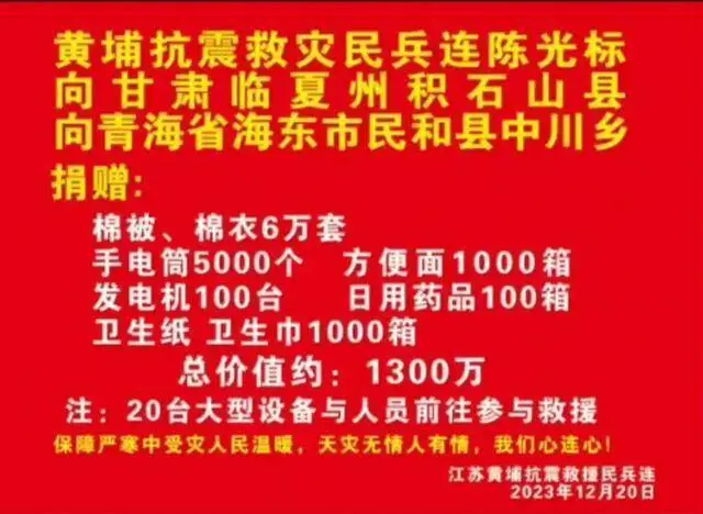这次甘肃积石山地震,陈光标也采用了汶川地震差不多的模式,不仅捐了物资,还组建了一支由他自己企业志愿者组成的“江苏黄埔抗震救灾民兵连”。