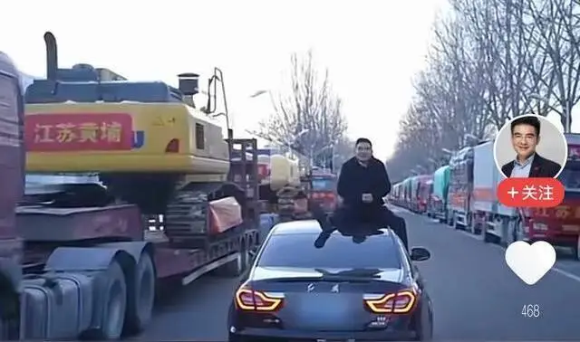 在另一段视频中,陈光标直接爬到了一辆红旗轿车的车顶上盘腿而坐,红旗轿车载着他缓缓在路上驶过,路两边都是装满救灾物资挂着横幅的运输车辆。