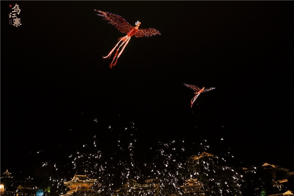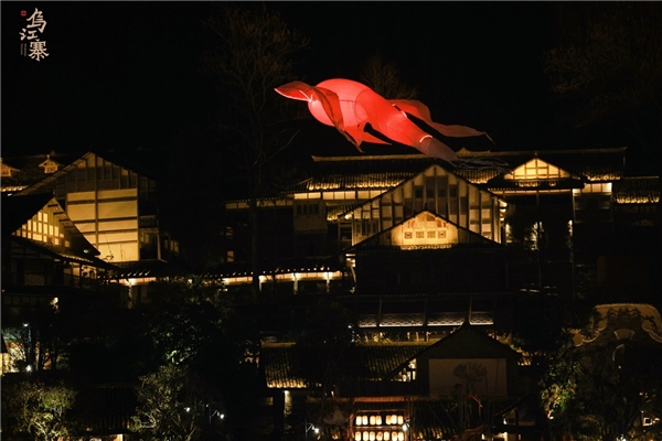 就在游客和乐迷们还在欣赏自己拍下的凤凰飞天和打铁花的大片时,一条长达14m的“天空之鱼”慢慢遨游在乌江寨的夜空,随后便听到现场响起阵阵惊呼声,“哇~快抬头看,那不是红遍全球的法国飞鱼秀吗?竟然到乌江寨来了。”