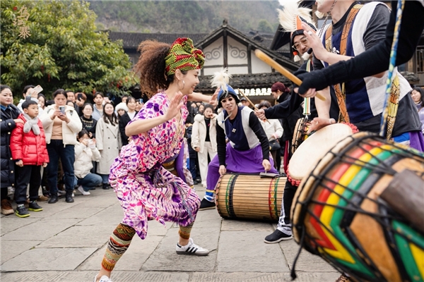 时至当天下午14点,乌江寨内各个景点都上演里精彩的表演,廻龙岛广场的非洲鼓、澳洲大管/手碟/民俗打击乐/笛子、围炉冬歌乐队演出的民谣及摇滚、视觉弯刀/手烛部落融合舞/毛利绳球等,还是国酒门的黔北酒歌、酿酒舞、酿酒情景剧;芦笙广场的侗族琵琶歌、仡佬族互动节目、黔北民舞;炎黄茶馆的民族弹唱、脱口秀、书评+川剧变脸;廻龙岛古戏台的竹竿舞、民间小调演唱、高山流水、板凳舞;以及梯田广场的掌灯仪式等,都为到场的万千游客提供了一轮又一轮的视听满足。