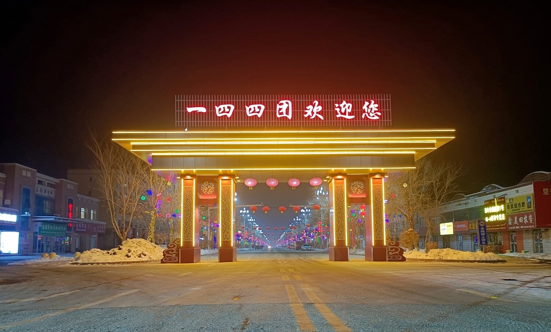 “快过年了,我们一家从外地回到一四四团来过年。今晚,我们一家然后吃过晚饭后来散步,看到这挂着彩灯特别漂亮,让人感觉到就是春节的脚步越来越近了,心情也特别好,我们一家人都特别开心。”刘雅荣对一四四团焕然一新的城镇风貌赞不绝口。