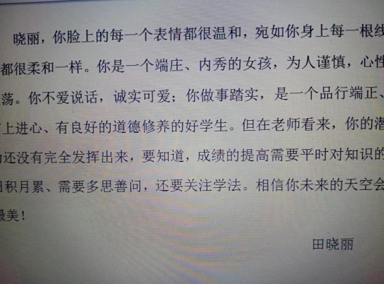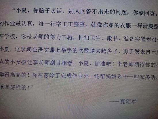 “小夏,你脑子灵活,别人回答不出来的问题,你能回答。 你的作业最认真,每一行字工工整整,就像你穿的衣服一样清爽整齐;在学校,你是老师的得力干将,打扫卫生、搬书、准备实验器材……小夏,这学期在语文课上举手的次数越来越多了,勇于发表自己的观点的小女孩让李老师刮目相看,小夏,加油吧!李老师期待你的小手举得高高的!你在家除了完成作业外,还帮妈妈多干一些家务活,你真是好样的!”2月1日,武穴市第六实验小学五(8)班夏硕军同学从班主任李老师手里接过素质报告书,读完后,脸上挂满了幸福的笑容。