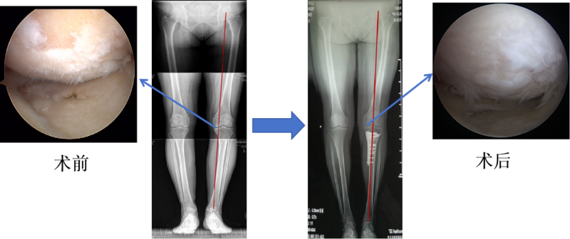 胫骨高位截骨术主要用于治疗以内侧间室退变为主的膝骨关节炎。通过针对胫骨的截骨矫形,纠正下肢力线,在内外侧关节间室重新分配应力负荷,从而起到治疗膝骨关节炎的效果。在矫正下肢力线后的患者中,异常应力负荷的去除改善了力学微环境,在改善患者症状的同时观察到了受损软骨的再生和炎症的缓解。