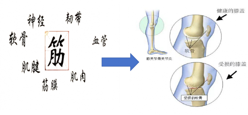本病属于中医“痹症”、“膝痹病”及“骨痹”等范畴。《内经》有云“病在骨,骨重不可举,骨髓酸痛,寒气至,名曰骨痹”。《中藏经》“骨痹,乃嗜欲不节,伤于肾也”。然KOA作为慢性进展性病变,是一个由浅入深、由局部至整体的渐进性病理过程,其病程日久,不能仅仅考虑“骨痹”这一角度,更应考虑到骨、筋以及肌肉三者在疾病发展过程中的相互影响。多种因素引起膝关节筋骨系统的病变,改变了筋束骨而利关节的作用,出现筋不束骨的病理变化,则膝关节的内外应力平衡失调,筋骨结构与功能发生退变,导致膝骨关节炎的发生。《素问·痹论》云“痹在骨则重,在于脉则血凝而不流,在于筋则屈伸不利,在于肉则不红,在于皮则寒”。由此可知KOA虽病位在于“软骨”,但其疾病的发生、发展应涵盖骨、筋、肌肉三者之间的相互作用。筋在外,骨在内,膝骨关节炎时筋先病变,随着疾病发展,再伤及骨。中医认为膝骨关节炎与“虚”、“邪”、“瘀”有密切关系。肾主骨,肝主筋,人至中年后,肝肾渐亏,骨节失养,膝关节局部劳损瘀阻,复加风寒湿侵袭,经络不畅,气血痹阻而发病。