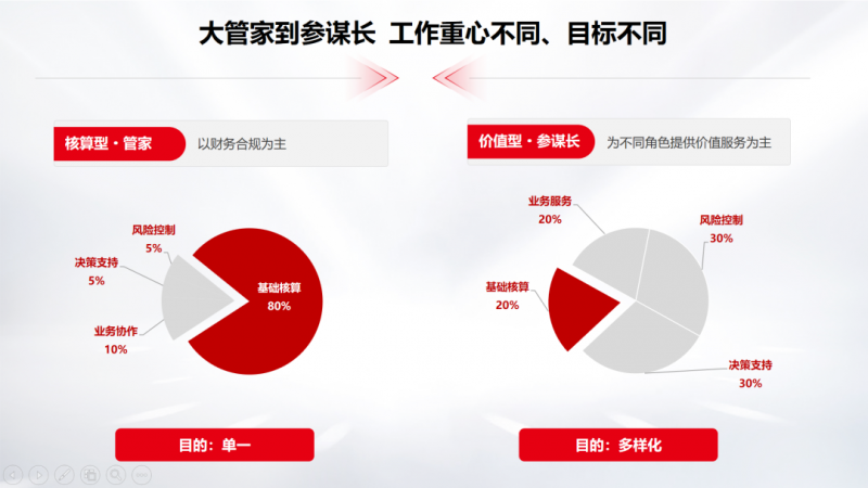 通过价值型财务的工作使命可以明显看出核算型财务与价值型财务的工作目标、工作重心不同:传统的财务注重核算,更像一个保障企业合法合规经营的后勤部门,而价值型财务更多的是为业务经营服务,参与企业决策,为企业经营提供指导,更注重事前、事中控制,是业务的伙伴,是企业管理者的参谋长。