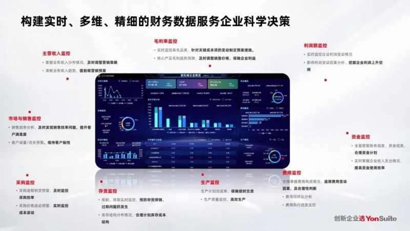 在YonSuite的支持下,企业能够应对随着快速发展而日益增加的财务要求,尤其是在激烈的市场竞争环境中。YonSuite的事项会计中台+智能分析解决方案使财务从传统的记录型工作转变为分析决策型工作成为可能,财务部门现在需要更深入地介入企业经营,从而在合规、增收、增利、资金管理等领域发挥更大作用。