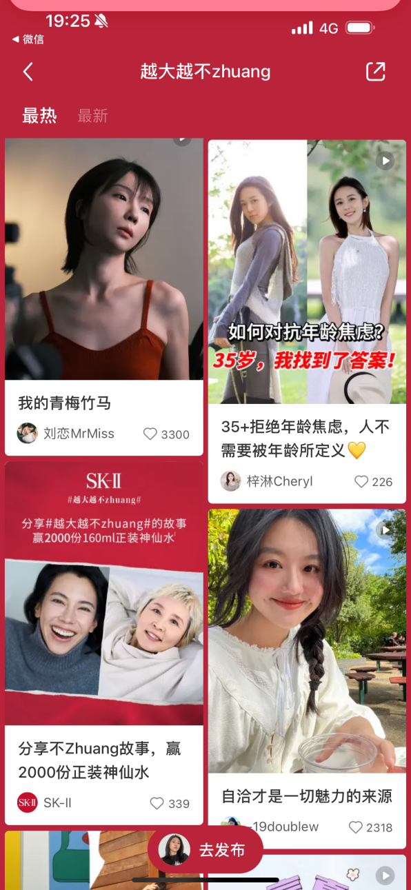 对当下的真实洞察,正是SK-II始终能赢得消费者青睐的原因。在小红书上,SK-II 聚焦“脱美役”这一现象,发起 #越大越不Zhuang # 话题,鼓励用户分享自己的故事,通过更多真实、鲜活的案例,为女性的活法给出参考答案。