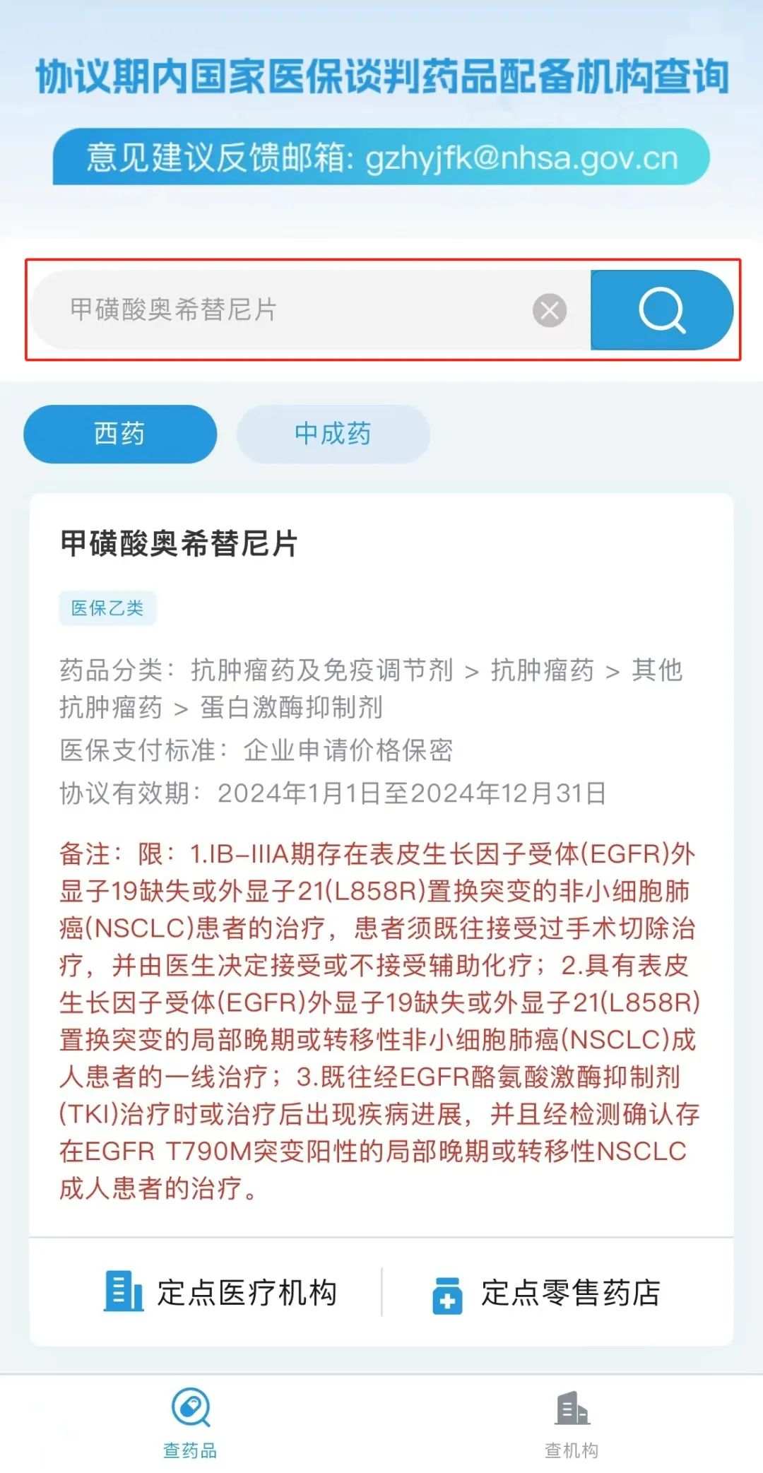 同时,您也可以点击页面下方“查机构”,进入“定点医疗机构”或“定点零售药店”页面,确定具体的医疗机构或零售药店后,点击“药品查询”,了解该机构配备的全部“国谈药”情况,如下图所示。