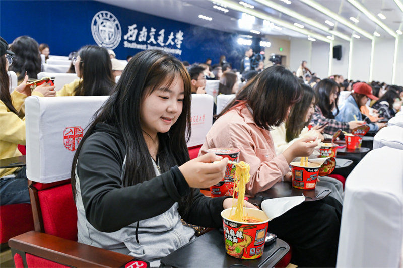 ▲现场同学一同品尝白象大辣娇牛油麻辣火锅面