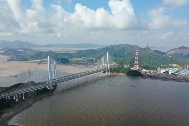 作为甬舟铁路的关键性工程之一,桃夭门公铁两用大桥全长1534米,其中公铁合建段长1066米,连接册子岛和富翅岛。为更好适应两岸特殊地形地貌,主桥采用混合梁斜拉桥,边跨采用混凝土箱梁,中跨采用钢箱梁。主桥采用公铁平层布置,铁路在中间,公铁在两侧。