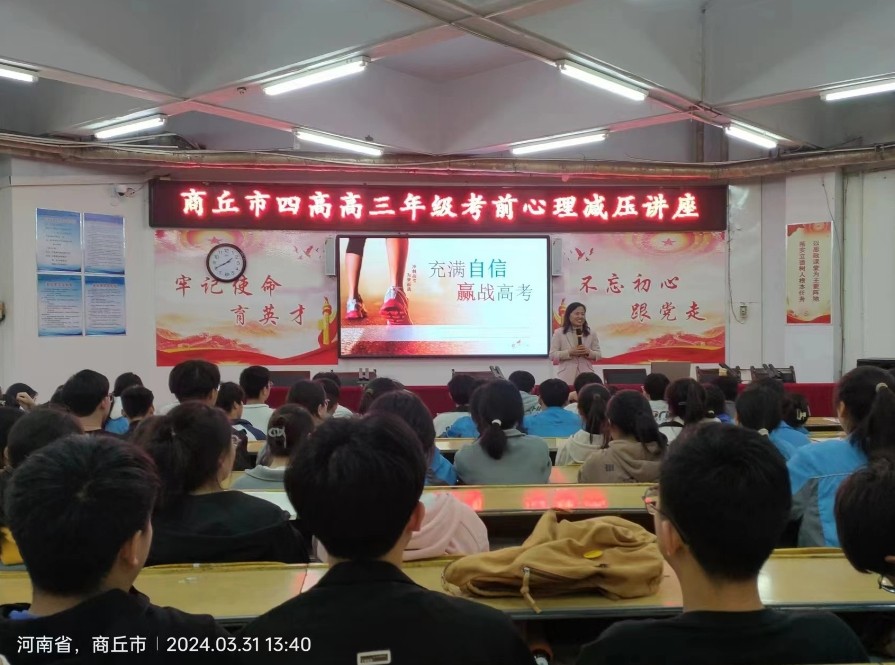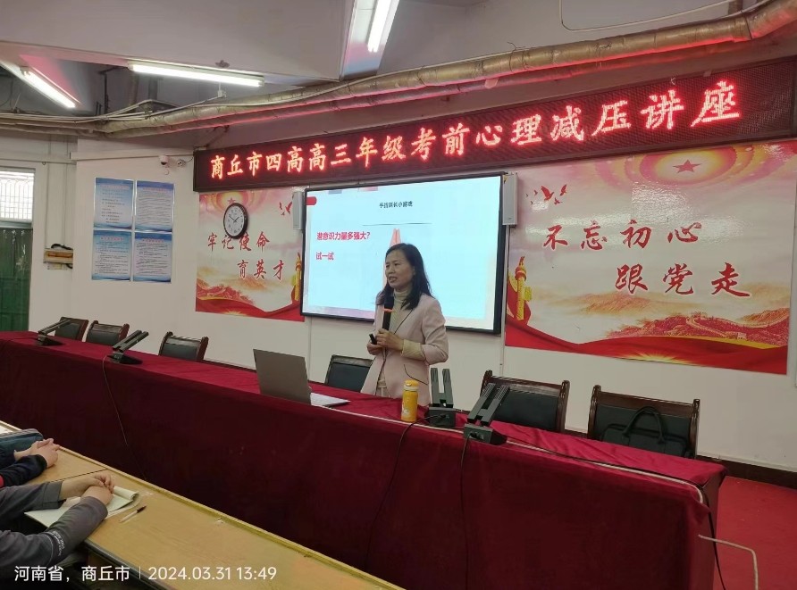 高考,对于每一个学子来说,都是人生中的一次重要考验。它不仅考验着我们的知识水平,更考验着我们的心理素质。在这个距离高考还有67天的时刻,面对这样的挑战,为了对高三学子心理减压,3月31日下午2时,在商丘市第四高级中学道德讲堂,心理学专家罗秀菊为高三的优秀学子做了一场考前心理减压专题讲座!