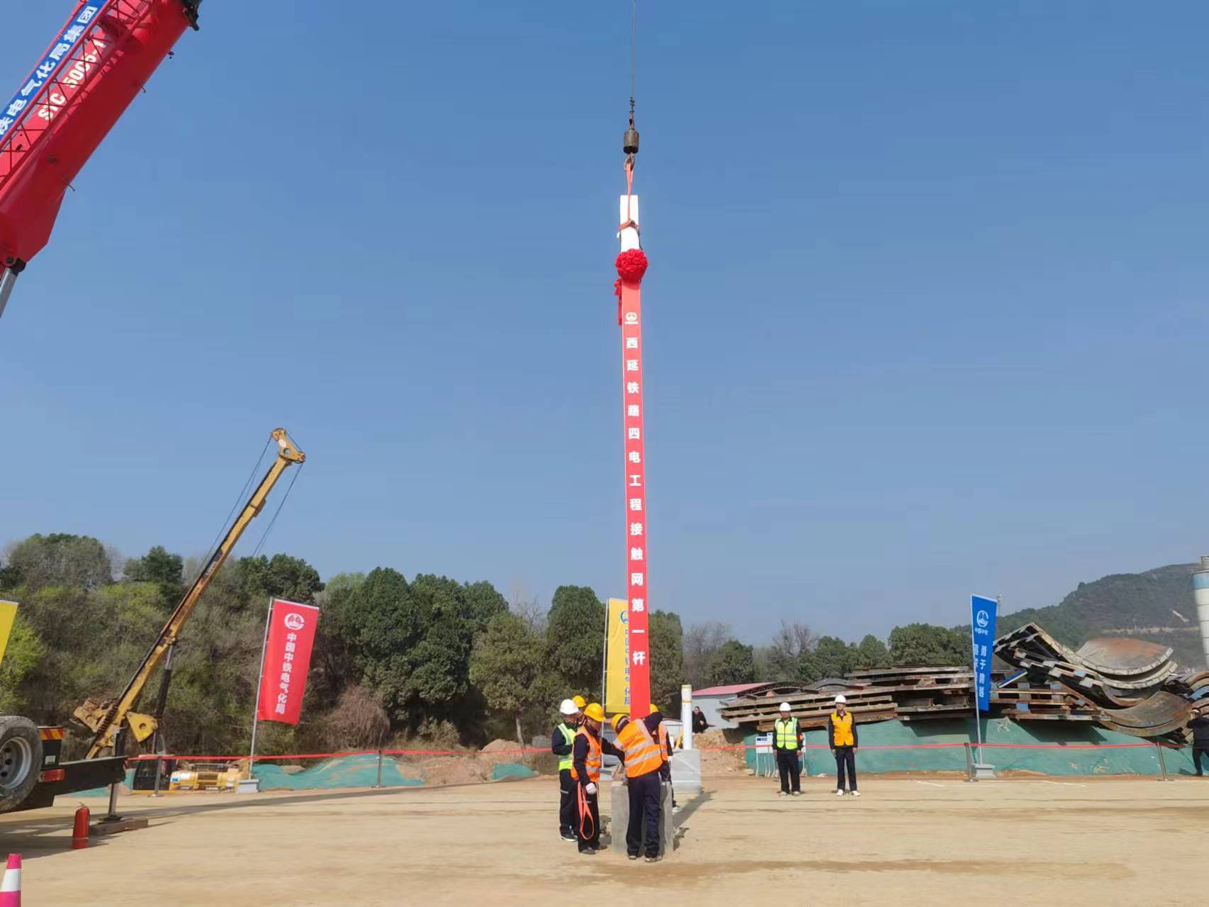 4月8日上午10时,在陕西省延安市黄陵县境内的西安至延安高速铁路(以下简称西延高铁)施工现场,随着起重车缓缓将接触网杆吊装到位,由中国中铁电气化局参建的西延高铁接触网第一杆成功组立。这标志着该线路铜川至延安段“四电”专业施工全面启动。