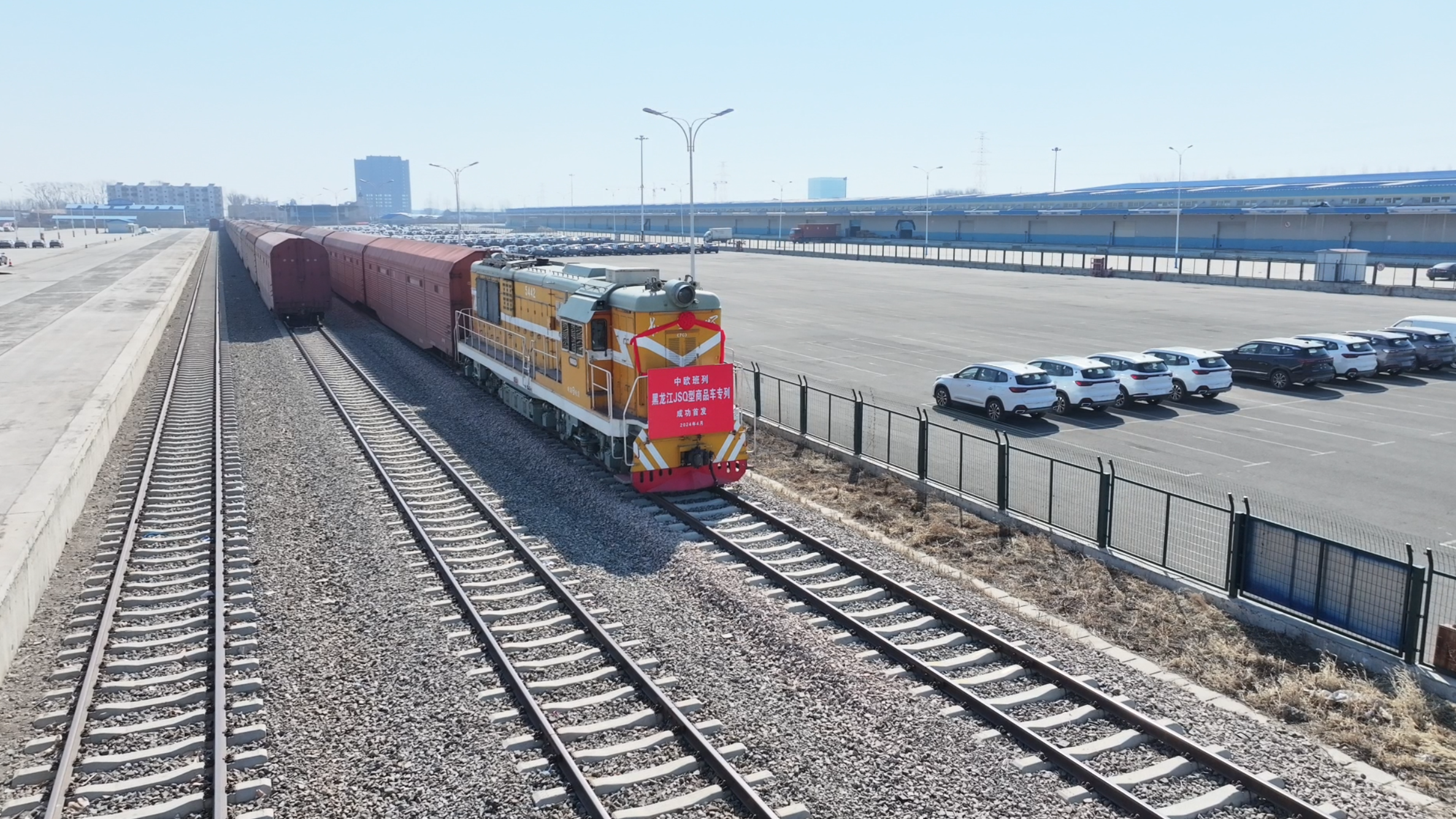 4月9日,一列编组29节JSQ(商品车铁路运输)专用车厢,满载290台国产商品汽车的中欧班列从哈尔滨国际集装箱中心站始发,经满洲里铁路口岸出境驶向欧洲。这是黑龙江省开行的首趟JSQ专用车型商品车中欧班列,装运量提升一倍,商品车安全也更有保障。