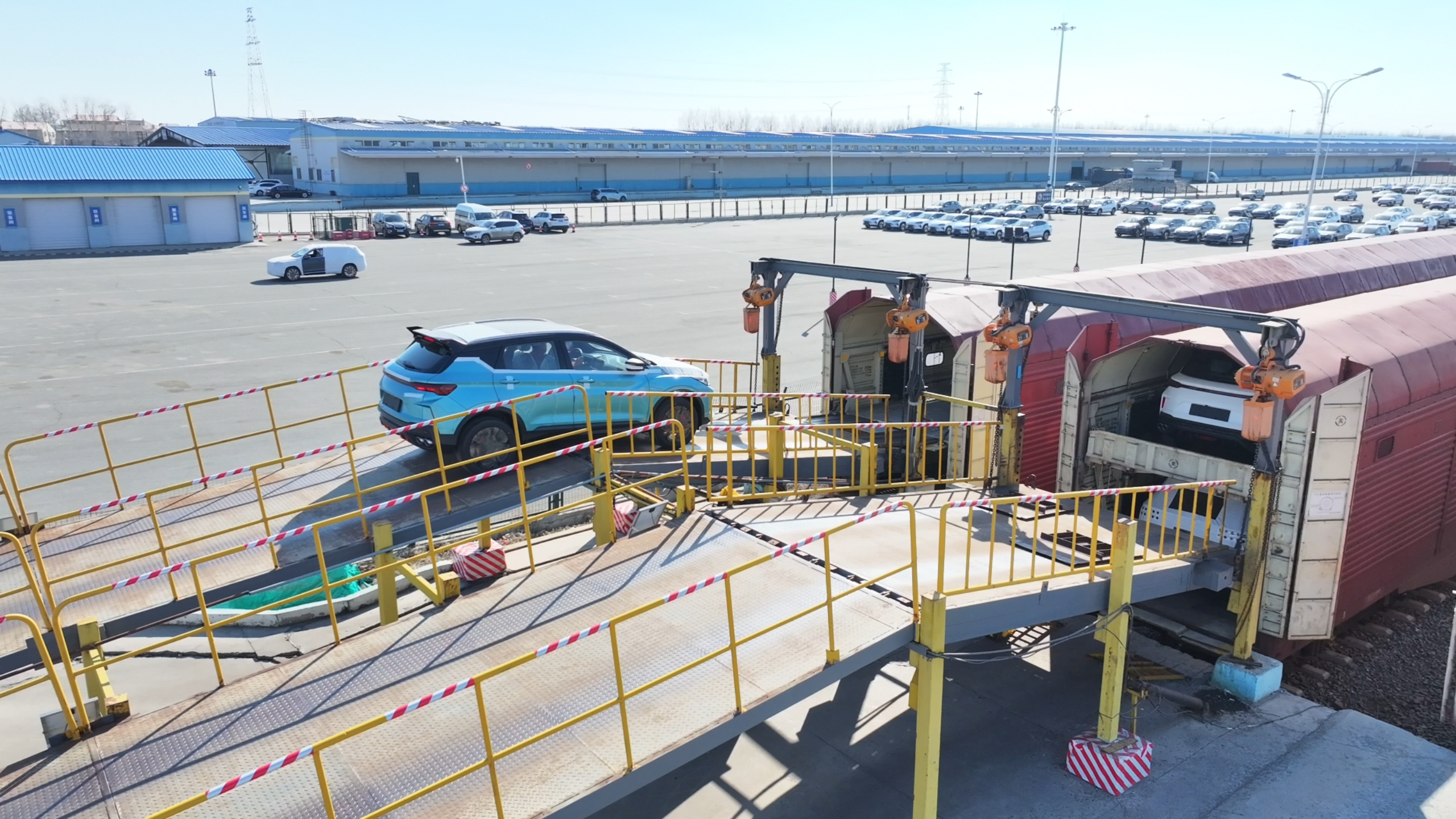 首次开行的JSQ专用车型商品车中欧班列,车厢内设上下两层结构,每节车厢可搭载8至10辆商品汽车,相比传统集装箱装运量提升一倍。全封闭车厢能避免车体损伤,商品汽车通过专用器械固定,运输过程中更牢固安全。同时,车厢内部贯通,汽车可直接驶入车厢,大大提高装车效率。