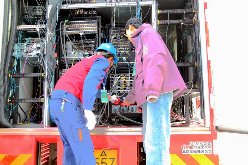 4月16日,国网青海电力三江源(黄化尖扎)共产党员服务队队员为中央广播电视台转播车检查运行情况。王星宇 摄