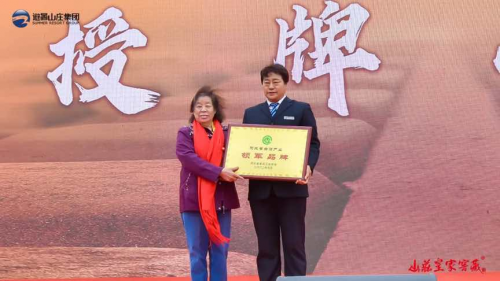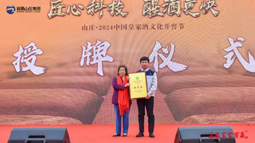 在开窖节上,河北省食品工业协会书记吴龙妹为山庄集团颁发河北省科学技术特等奖奖牌以及河北省白酒领军品牌牌匾。