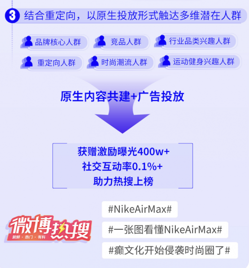 试运营期间,微博进一步扩大了原生投放的 “流量激励比重”,单博文可享受双重流量激烈,最高可获赠300%的曝光,目前NIKE、王者荣耀、携程已经率先吃到红利。