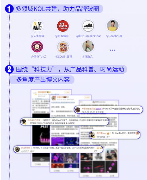 Nike Air MAX新品上市,品牌优选垂直类达人,围绕新品科技力,从秀场解读、产品科普、时尚运动生活等炒热概念。达人矩阵发声,突破流量边界,多维助力品牌破圈。