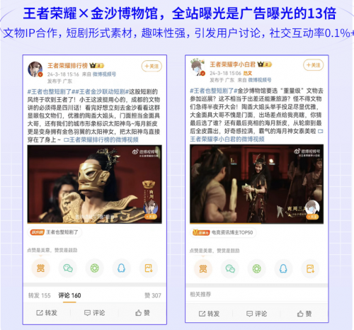 王者荣耀携手金沙遗址博物馆 ,发布以古蜀金沙文化为灵感的联动皮肤“海月-金乌负日”。东方美学赋能电子游戏,加强了王者荣耀的文化底色,经由原生信息流广告的传播,全站曝光提升至13倍于广告曝光,引发全民关注。与此同时,戚薇受邀COS海月,明星粉、游戏粉双厨狂喜,跨界合作曝光加倍,粉丝相互转化。