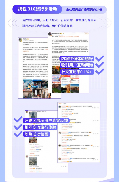 携程318旅行季,品牌合作旅行博主,从衣食住行、行程安排、城市景点等方向,输出小众、精品旅行攻略。品牌采用原生信息流投放,结合利益点输出,吸引用户主动问询、评论区反馈助推,体现品牌优势,增强用户信任。