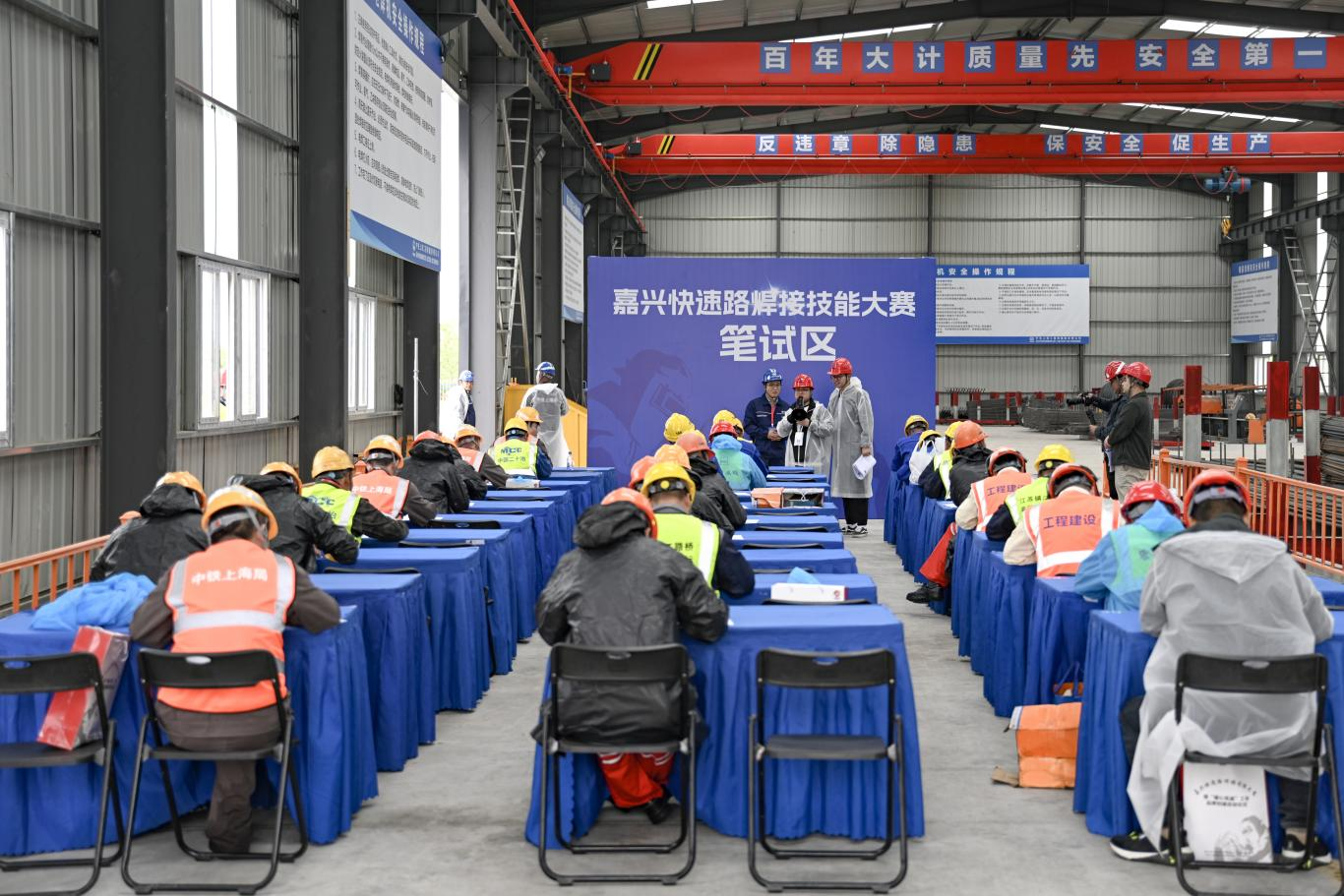 焊机轰鸣,焊枪在接触焊缝的瞬间蹦出明亮的火花,选手们手持面罩埋头专注点焊。4月28日,在嘉兴快速路环线三期二阶段1标梁场内,一场焊接技能大赛正火热进行。