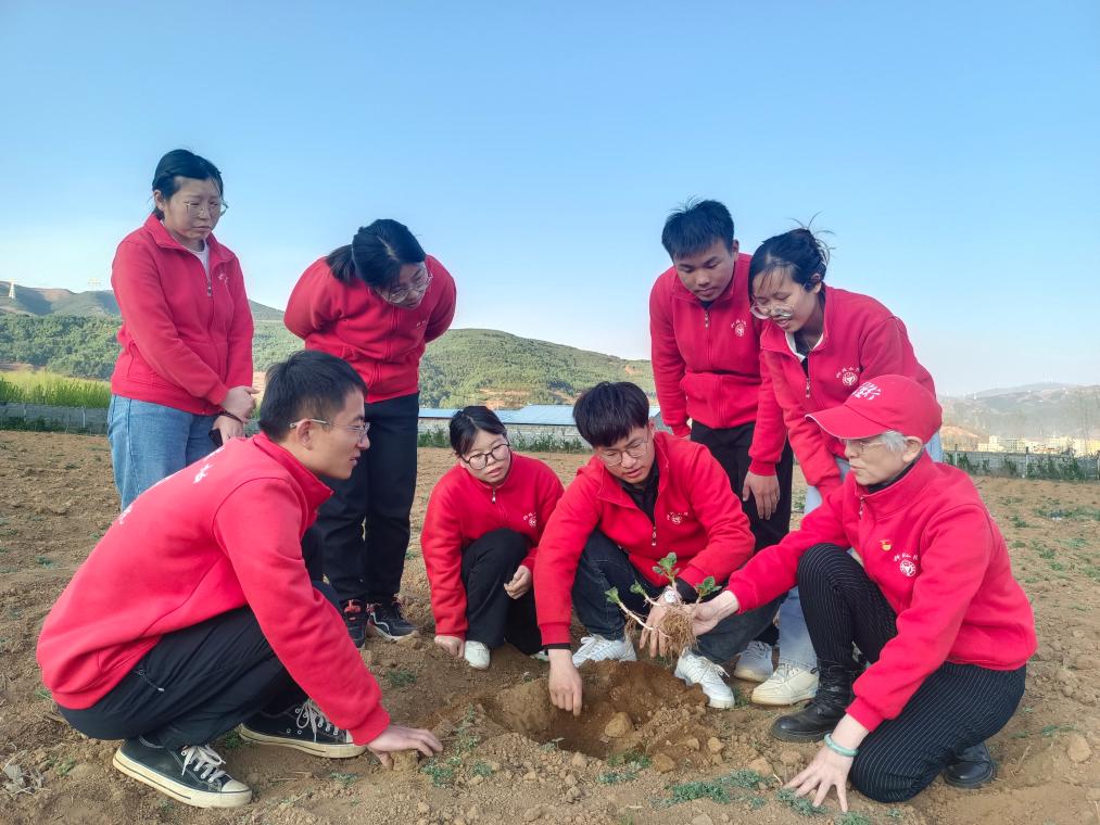 四川农业大学王西瑶教授带领张峰(前排左一)等研究生在布拖马铃薯科技小院查看马铃薯出苗情况。(受访者供图)
