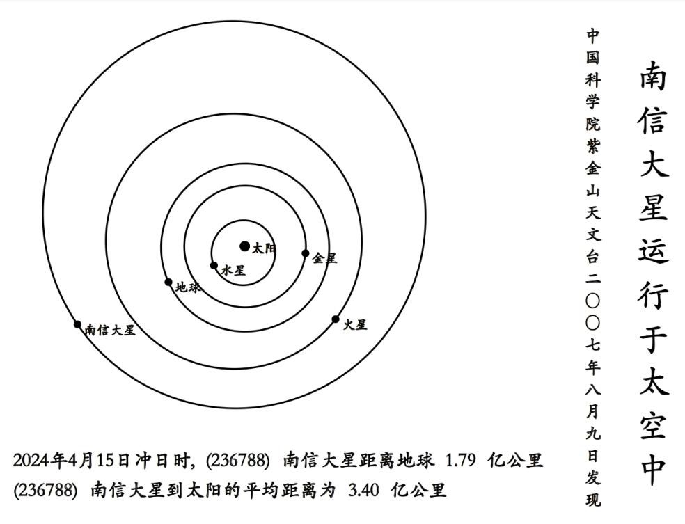 该小行星于2007年8月9日由紫金山天文台近地小天体搜寻项目组在江苏省盱眙县发现。“南信大星”的命名,标志着国际社会对于南信大64年办学发展成就特别是为全球气象事业发展所作贡献的充分肯定。据悉,2024年4月15日冲日时,“南信大星”距离地球1.79亿公里,“南信大星”到太阳的平均距离为3.40亿公里。
