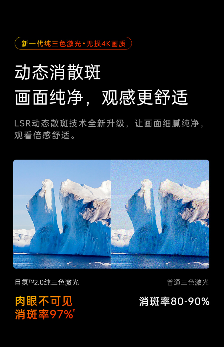 针对三色激光光源先天存在的散斑问题,坚果投影积极应对,展现了行业领先的技术实力。其MALC目氪™2.0纯三色激光光机采用专利LSR动态消散斑技术,通过独特的振动方式及频率来消除激光间的相干性,以无序消除有序,从而达成97%的散斑消除率,达到行业领先水平,确保用户享受纯净画面。