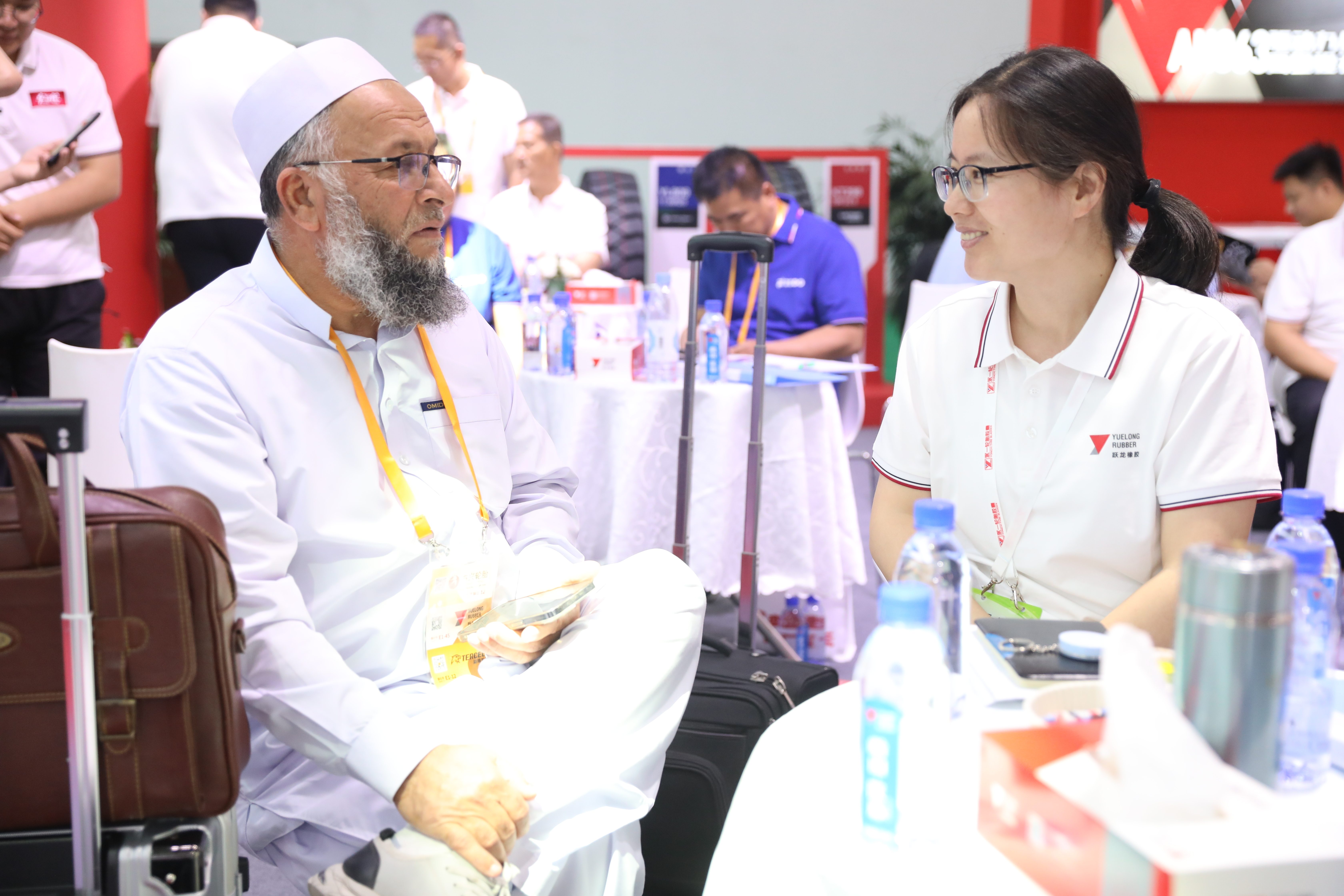 在第十四届中国(广饶)国际橡胶轮胎展览会上,参展商正与外商洽谈业务。 受访者供图