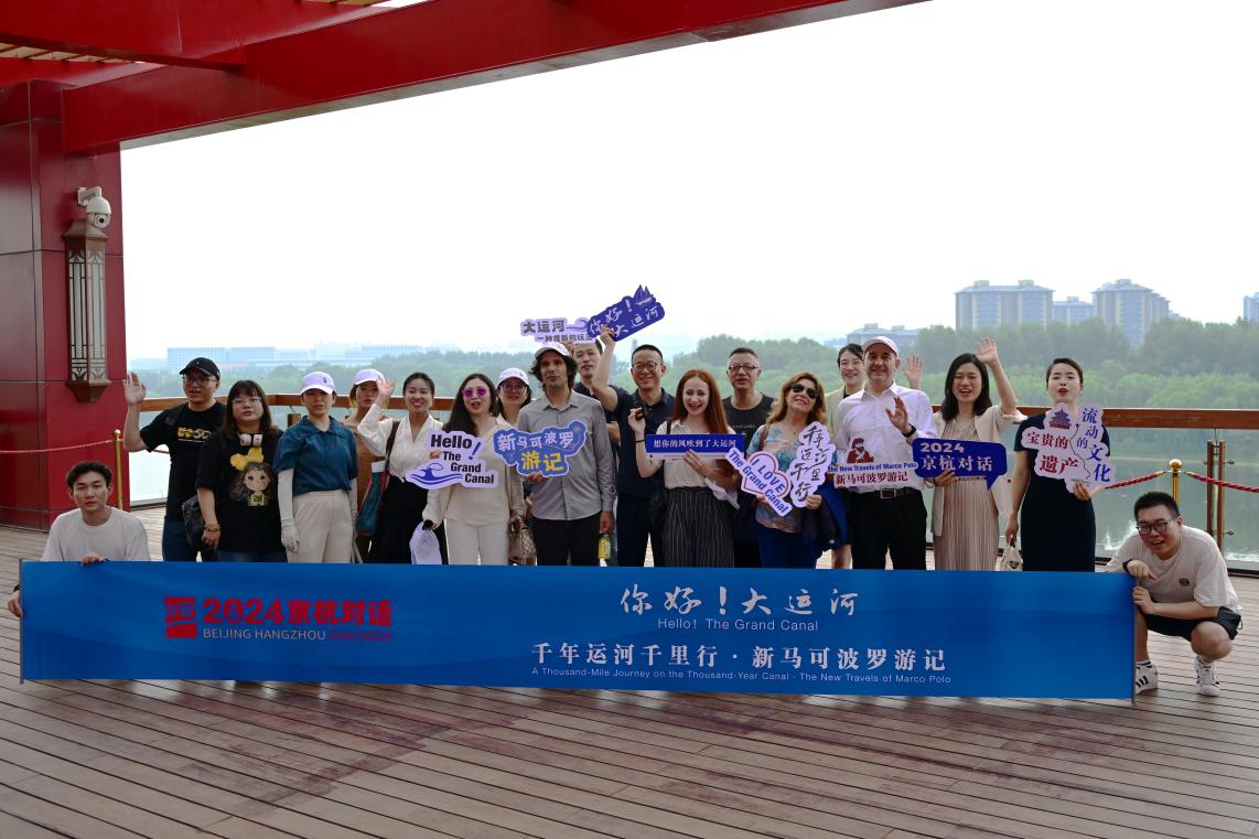 千年运河千里行·新马可波罗游记采风团“打卡”北运河。(田雨昊 摄)