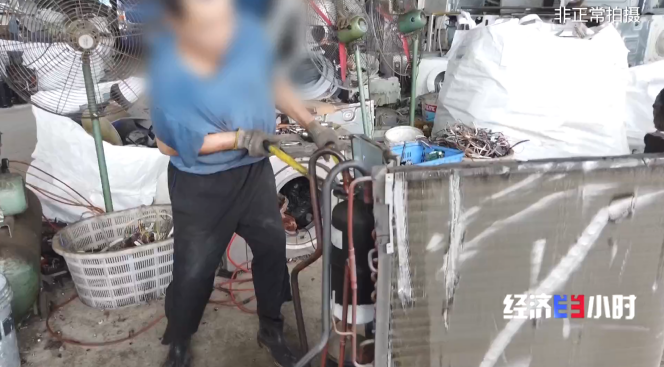 两个工人正在拆解空调,拆解下来的零部件随意被堆放在地上,工人将空调外壳打开之后,直接用剪刀将里面的电线电缆剪下放在筐子里。对于连接压缩机和热交换器的铜管,工人直接用长柄剪刀剪断,铜管被剪断的时候,里面的制冷剂一下子喷了出来。而制冷剂中含有会危害臭氧层的化学物质。