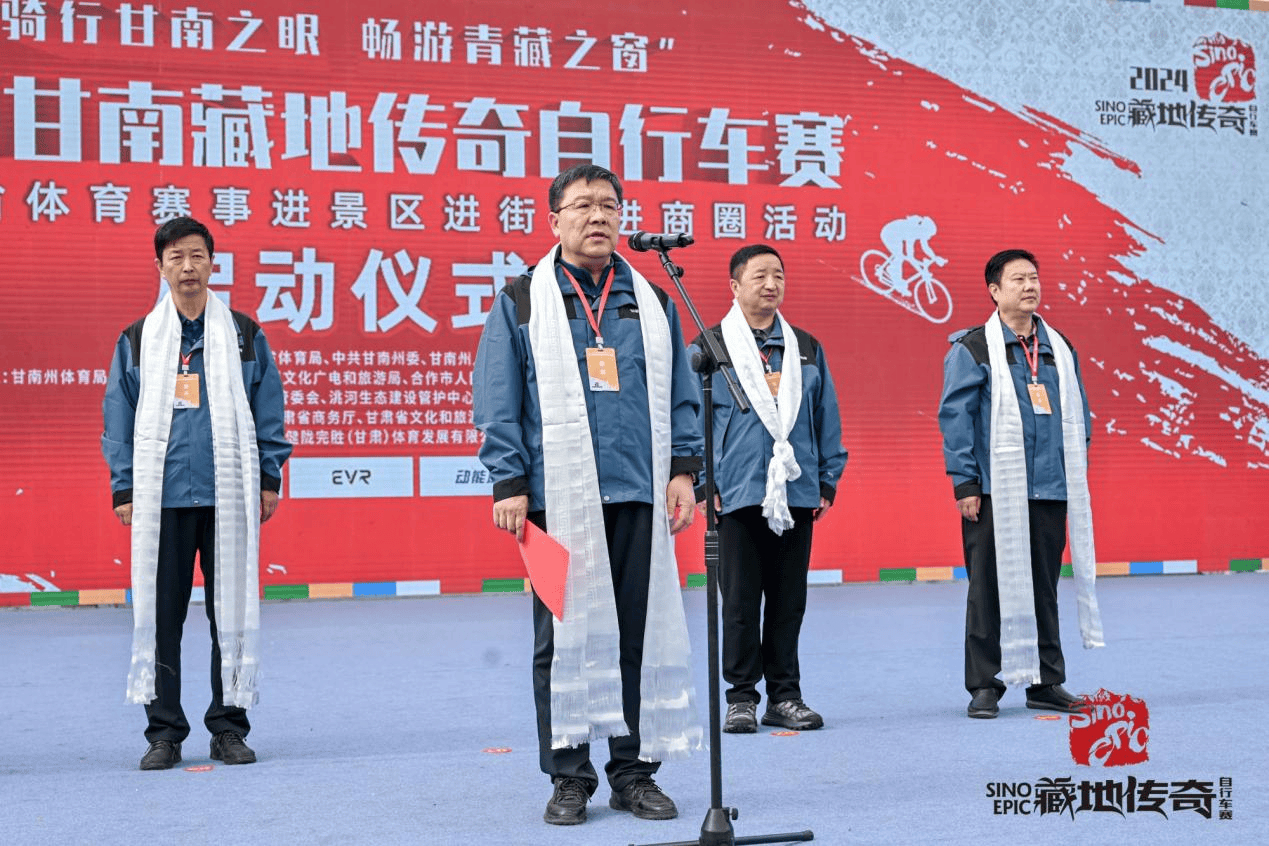 6月15日,2024甘南藏地传奇自行车赛开幕式暨甘肃省体育赛事进景区进街区进商圈活动启动仪式在合作市香巴拉文化广场举行。甘肃省体育局党组书记、局长王向晨,甘南州委副书记、州长杨武,甘南州人大常委会主任王建军出席仪式,甘南州委副书记胡晓华主持仪式。