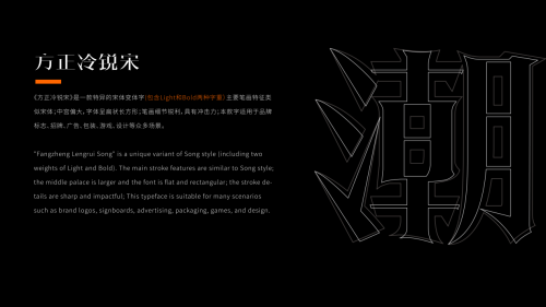 方正冷锐宋家族是一款特异的宋体变体字,包含细体和粗体两档字重。主要笔画特征类似宋体;中宫偏大,字形呈扁状长方形;笔画细节锐利,具有冲击力;适用于品牌标志、招牌、广告、包装、游戏、设计等众多场景。