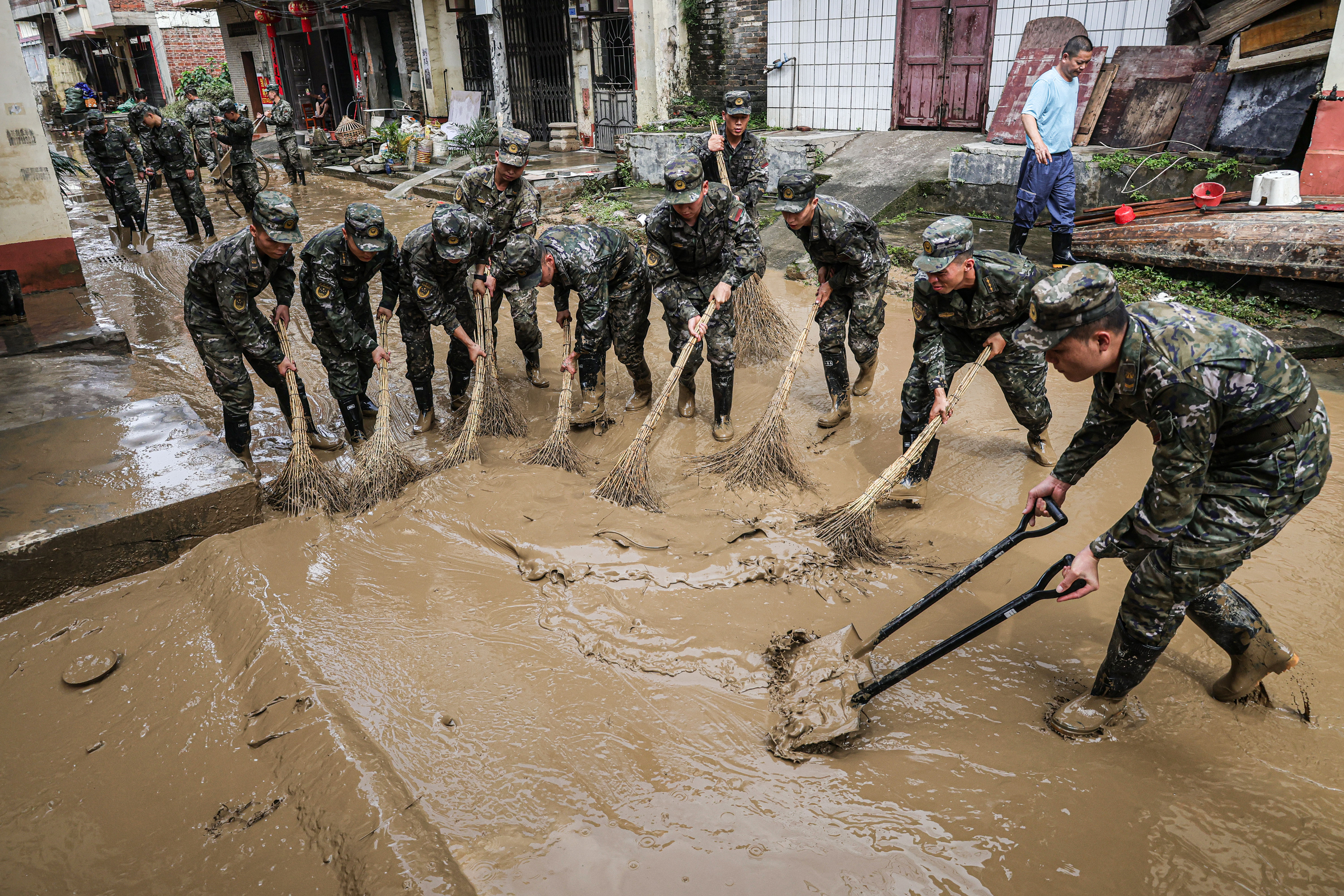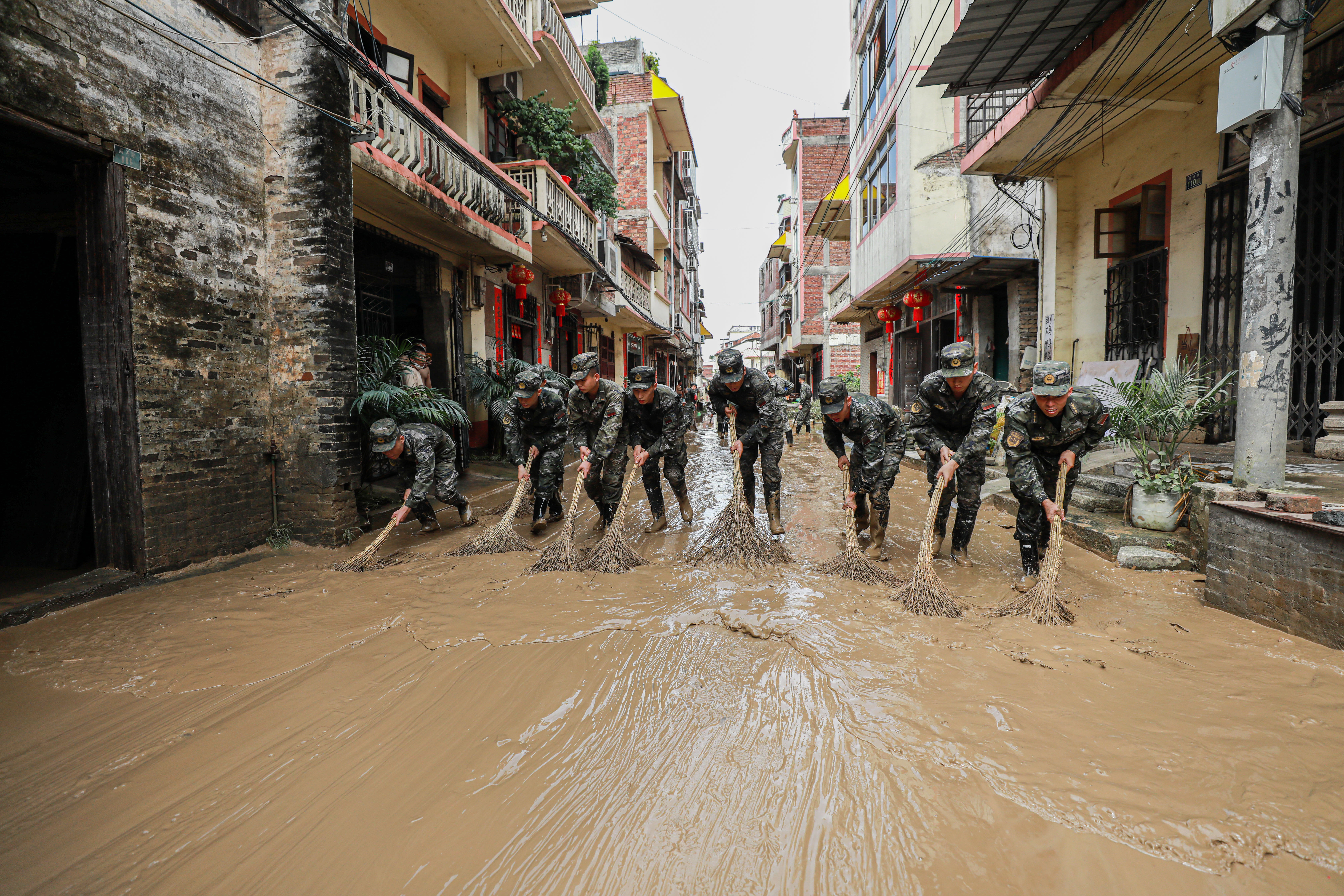 经请示上级获批后,6月22日11时许,武警广西总队梧州支队动用30名兵力携带清淤工具,赶赴龙圩区龙圩镇高冲街,与驻地民众一起开展转移物资、路面疏通及淤泥清理等任务。