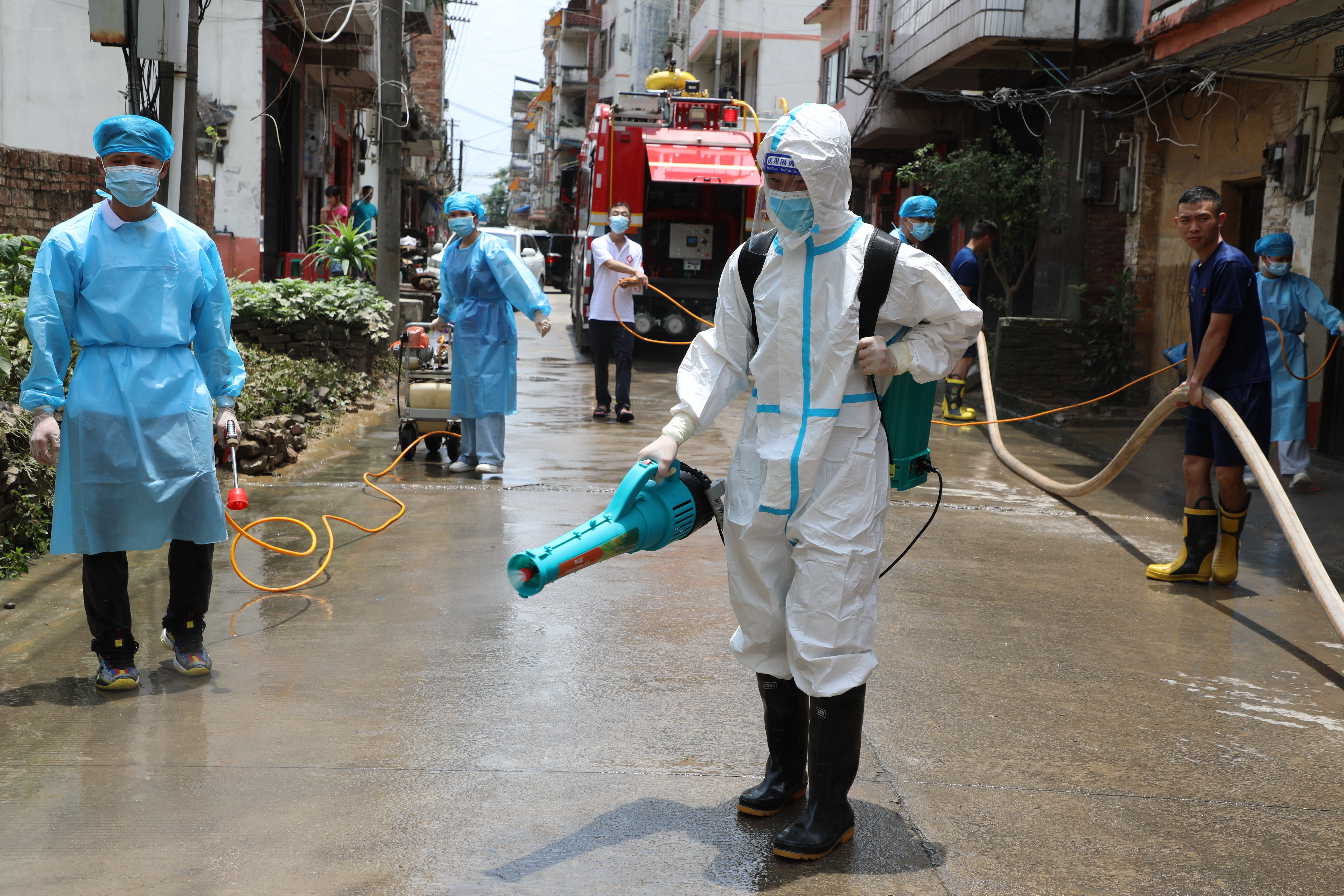 清淤现场,武警广西总队梧州支队卫生员对清扫后街道进行消杀。范成冠 摄