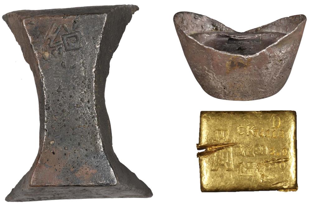 左为唐末-五代“绍”字五十两银锭,右上为清代“湖北盐厘局薛永陞”五十两银锭,右下为民国时期官方造币厂生产的金锭。(中国国家博物馆供图)