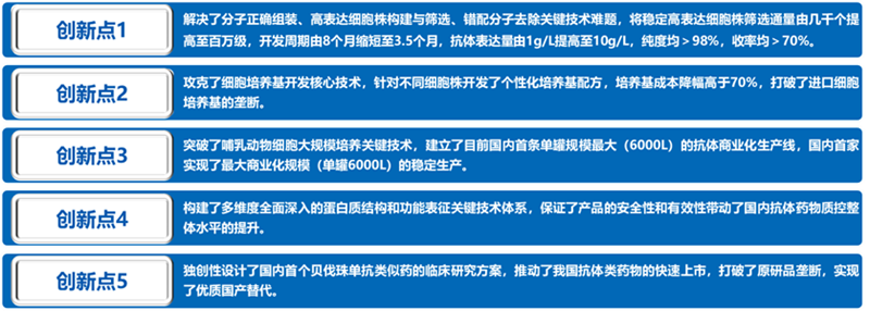项目攻克的5项“卡脖子”关键技术:①解决了分子正确组装、高表达细胞株构建与筛选、错配分子去除关键技术难题,将稳定高表达细胞株筛选通量由几千个提高至百万级,开发周期由8个月缩短至3.5个月,抗体表达量由1g/L提高至10g/L,纯度均>98%,收率均>70%。②攻克了细胞培养基开发核心技术,针对不同细胞株开发了个性化培养基配方,培养基成本降幅高于70%,打破了进口细胞培养基的垄断。③突破了哺乳动物细胞大规模培养关键技术,国内首家实现了最大商业化规模(单罐6000L)的稳定生产。④构建了多维度全面深入的蛋白质结构和功能表征关键技术体系,保证了产品的安全性和有效性。⑤独创性地设计了国内首个贝伐珠单抗类似药的临床研究方案,推动了我国抗体类药物的快速上市。