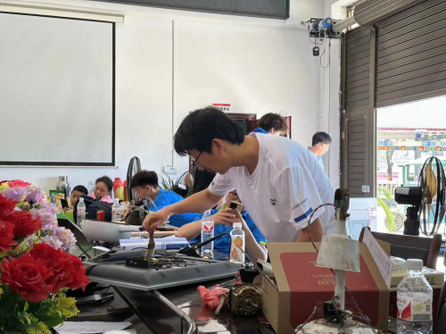 在学校,以笔为桨,他们自在地徜徉于学海;而今,以螺丝刀为友,他们把脑海里搭建的知识体系转化为实践。先拿出万用表,熟练地接线,测出内部线路的情况,再拿出螺丝刀,三下五除二便把外壳卸下。然后,在带来的“百宝箱”中选出合适的电子元器件,另一名组员搭把手,将电风扇扶稳,巧妙地往关键处使力。接着,万用表再次测量。最后,接上电源,凉风袭来——电风扇恢复正常!组装完成,交给负责登记的小伙伴通知物主取回。接下来是一个漏电的电饭煲,一台无法正常显示的电视机,一台无法制热的饮水机……对于义务维修组而言,这都是驾轻就熟的事。带队老师丰元不时给予指导,为义务维修提供坚实的技术保障。