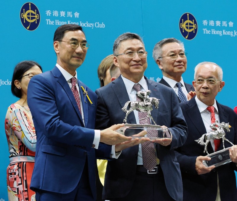图四:马会主席利子厚(左一)颁发奖杯予冠军练马师吕健威。