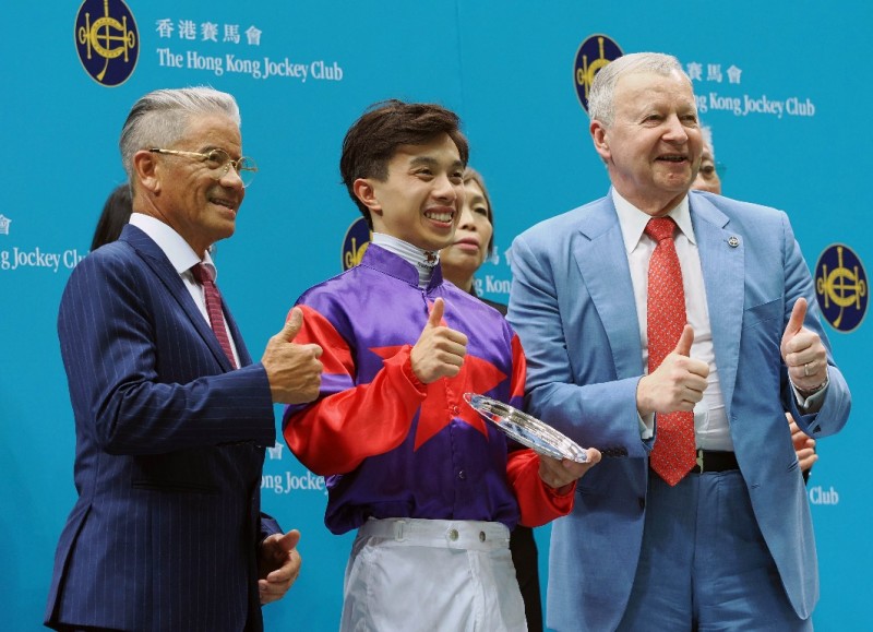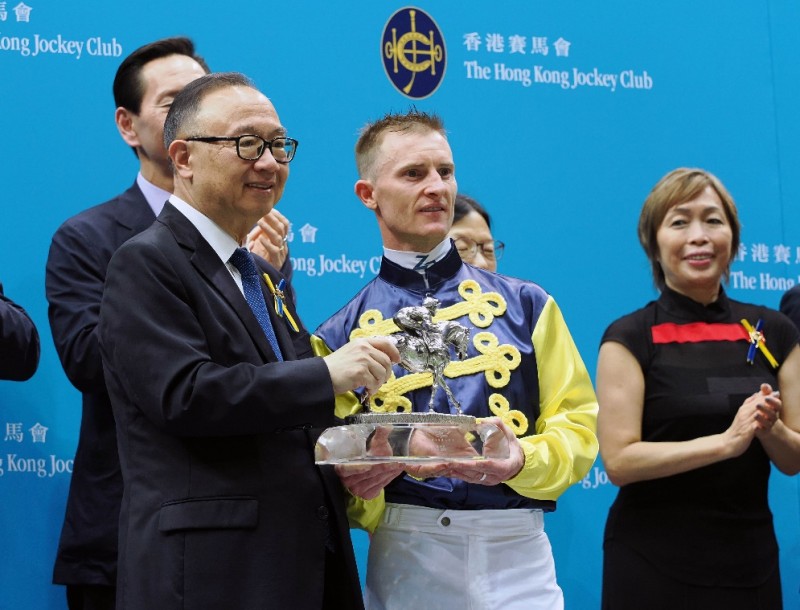 图三:马会副主席廖长江(左一)颁发奖杯予冠军骑师潘顿。