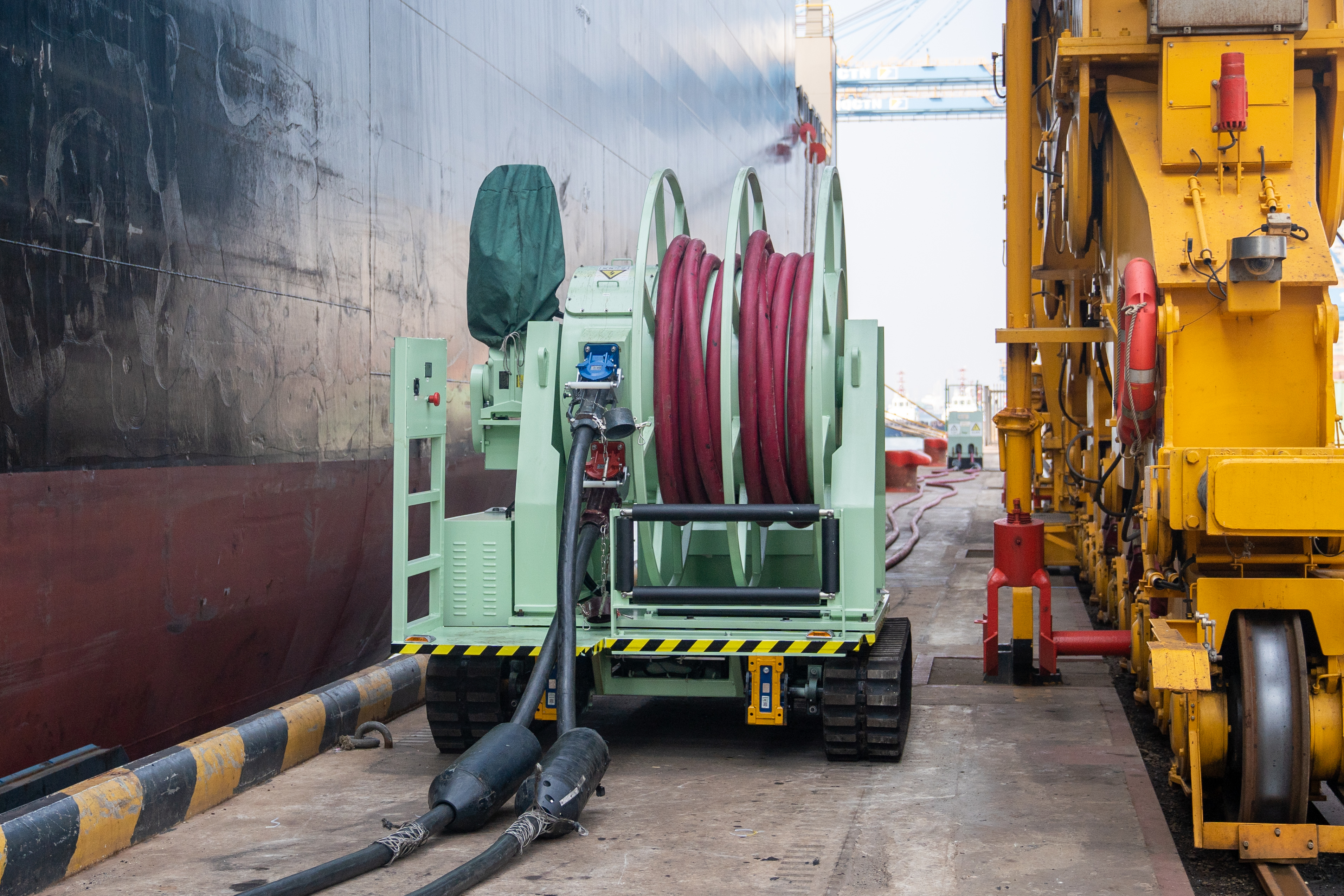 “高压岸电自行机器人采用多列多层大电缆卷缆模式,设备负载连接电缆长度超出同类产品两倍,连接距离更远,能够满足各类船舶全泊位连船需求。” 潘海青说。