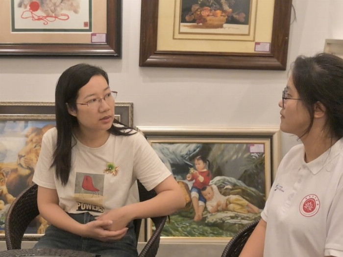 郑惠璇老师详细介绍每一副绣品背景(张婷栅 摄)